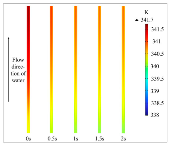 The proton exchange membrane remains the weakest part of the PEM cell [16]. Long-term uneven temperature distribution may lead to thinning in the proton exchange membrane and consequent damage, but a small degree of uneven temperature distribution is unavoidable. The current thermal management strategy for PEM electrolysis tanks involves regulating the water supply’s temperature and flow rate to promote a more uniform temperature profile. The flow control strategy proposed in this study can achieve comparable results. The current water supply temperature of 338.15 K is a safe and reliable value, even with a small temperature rise; it remains within a reasonable range, and furthermore, concerns regarding the effects of temperature changes during flow control are unwarranted.