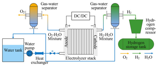 Figure 6 shows the schematic of the PEM EL system structure. In addition to the electrolyzer, the system comprises components such as adjustable DC/DC power supplies, a water tank, a water pump, a gas–water separator, a hydrogen compressor, a hydrogen storage tank, and a heat exchanger.