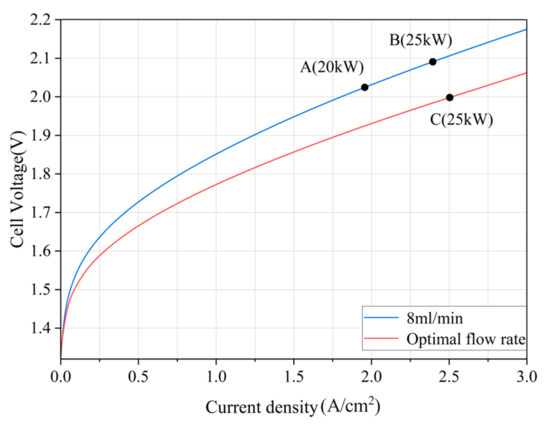 Obviously, after taking into account the energy consumption of the pump, there exists an optimal working condition of the electrolysis system, when the electrolysis efficiency is maximum. By setting different flow rates and solving the polarization curve in COMSOL, the optimal water supply flow rate curve can be obtained based on (5) and (6), and the optimal flow rate can be identified using an offline lookup table.