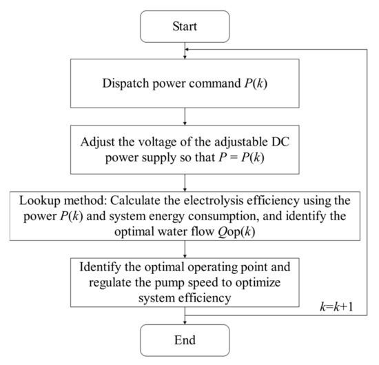 As shown in Figure 7, when the input power of the PEM EL system changes, its operating point moves from point A to point B through voltage regulation by an adjustable DC source, ensuring that the electrolyzer power P equals the power command P(k). Then, the optimal water supply flow rate Qop(k) for that power level is determined, and the water pump is adjusted so that the operating point ultimately reaches point C, where the PEM EL system achieves maximum efficiency under the new power input.