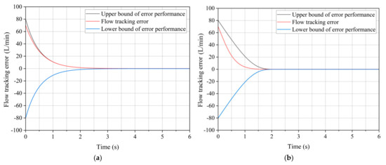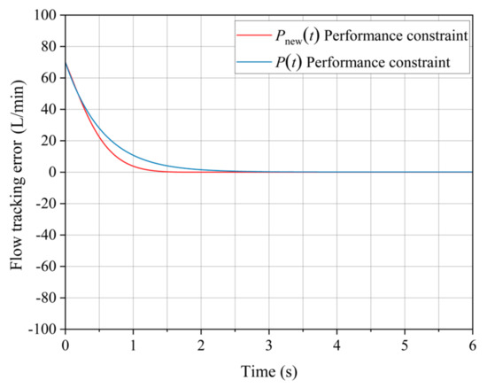 Figure 9 shows that both methods effectively track the flow changes, with no noticeable overshoot in either case. However, under the traditional constraint of the performance function P(t), the flow rate error decays very slowly and only decays to within the error allowance at about 3 s. Under the improved performance function Pnew(t) constraint, the error has reached the allowable margin of error at about 1.5 s.
