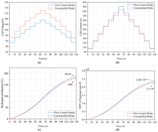 From Figure 12a, it can be seen that the electrolyzer voltage is significantly reduced in water flow control mode, and the effect is more significant with higher input power. The overvoltage loss in the electrolyzer is reduced by about 7 V at 44 kW input power. From Figure 12b, it is seen that the electrolyzer current is significantly higher in the water flow control mode, by about 18.2 A at 44 kW input power. This implies lower energy consumption and greater hydrogen production. Figure 12c indicates that at 130 s, the hydrogen production in the flow-controlled mode is 186.6 L, which is 6.6 L greater compared to the uncontrolled mode; as can be seen from Figure 12d, this corresponds to an increase of 8.32 × 104 J in available energy.