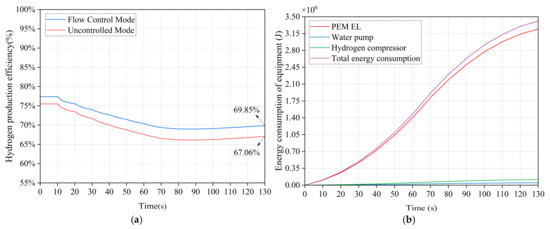 During the 130 s of simulation, as illustrated in Figure 13a, the system efficiency in flow control mode improved by 2.79% compared to the uncontrolled mode. As illustrated in Figure 13b, the total energy consumption is 3.41 × 106 J, with the energy consumption of the PEM EL at 3.245 × 106 J, representing 95.14% of the total energy consumption. The energy consumption of the hydrogen compressor is 1.173 × 105 J, representing 3.44% of the total energy consumption, and the energy consumption of the water pump is 4.837 × 104 J, accounting for 1.42% of the total energy consumption. The energy consumption attributed to the water pump is minimal, indicating that as the input power to the electrolyzer increases, its proportion will continue to decrease, thereby enhancing overall efficiency.