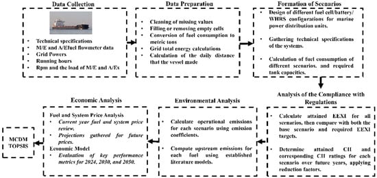 After data collection, the sensory data, collected at one-minute intervals, were pre-processed. Removal of empty values and grid power calculation have been conducted. The formation of scenarios, including FCs, batteries, and WHRS, has been arranged. The hybrid grid simulation has calculated the total fuel consumption of the marine power distribution plant units. The EEXI, CII, and operational and upstream emissions have been computed after the fuel consumption calculation. A cost-benefit analysis has been performed by computing installation and fuel costs. Finally, an MCDM analysis using the Technique for Order of Preference by Similarity to the Ideal Solution (TOPSIS) has been conducted to determine the preferred configuration, including the system design’s size, environmental performance, and economic efficiency.