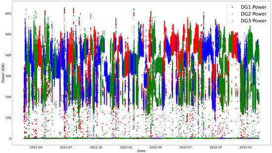 Data collection was conducted between 1 February 2021, and 10 February 2023, yielding 1,064,161 data points recorded at one-minute intervals. After preprocessing, the dataset comprises 1,003,490 data points, representing approximately 1.96 years of continuous operation. The collected parameters include power, fuel flow, temperature, and density for generators, electrical load analysis of ship consumers, main engine exhaust, power output, load, speed, and fuel properties. Data on fuel cells, battery performance curves, converter voltage, and conversion efficiencies have been sourced from relevant literature and commercially available manuals for hybrid systems. Figure 2 illustrates a sample of the collected data, showcasing the power outputs of the diesel generators (D/Gs).