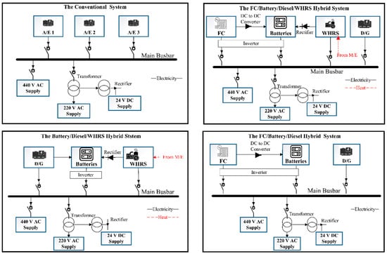 The conventional marine power distribution system comprises three D/Gs working in parallel. The vessel’s electricity demand dictates the generated power, while its magnitude allows for flexibility in selecting the number of simultaneous D/Gs in operation, which is integral to the optimisation process [45]. Figure 3 illustrates the simplified system scheme of the conventional system and the assessed hybrid power distribution systems.