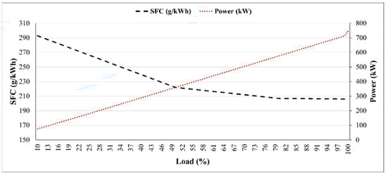 Regarding fuel requirement, SFC refers to the fuel consumed per unit of time necessary to generate a specified engine output [47]. Curves presented in Figure 4 have been utilised to calculate the fuel consumption of a conventional MDE operating HFO. The variable load of the D/Gs has been determined through simulation, and the corresponding SFC and power values were interpolated from the curve.