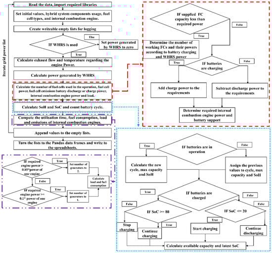 An energy management strategy (EMS) algorithm and simulation designed by the authors has provided the determination processes of load-sharing, the number of generators or FCs, and battery charging/discharging conditions. The simulation was developed in Python, and the powertrain options for the hybrid marine power distribution plant were conducted using the same code infrastructure. At the beginning of the simulation, the user can adjust the FC, battery, and WHRS implementations and their capacities. Figure 5 illustrates the simplified algorithm scheme of the simulation and EMS.