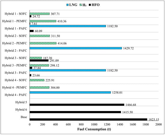 Ammar, et al. [41] analysed and compared LNG DF diesel-electric propulsion with different power limitations (25%, 15%, and 0%) and FCs on the propulsion system of an LNG carrier regarding economic and IMO-EEXI requirements. Results revealed that liquefied-H2 systems offered economically competitive costs of USD 2.1 and USD 2.5 per kilogram for hybrid options 1 and 2, respectively, compared to the dual-fuel diesel-electric system.