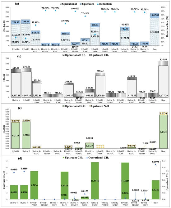 Chen and Lam [32] conducted an LCA study on tugboats powered by H2 PEMFCs and SOFCs, benchmarking their performance against conventional propulsion systems. The H2 FCs provided up to 85% GHG reduction, mitigating approximately 48.55 metric tons of CO2-eq emissions.