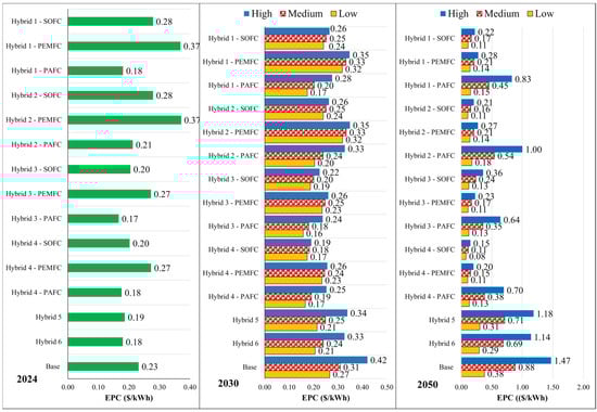 The comparison of various FC types in marine power distribution plants, including batteries and WHRS options for 2024, 2030, and 2050 projections, has been detected as a gap in the literature. This paper aims to develop a simulation framework that includes SOFC, PEMFC, and PAFC as FC options and battery and WHRS-support configurations to evaluate retrofit options for the onboard electricity generation plant. In recent years, PAFCs have been selected as a promising solution for emission reduction due to their use of LNG. Conversely, scenarios involving SOFCs and PEMFCs considered running on H2 aim for more aggressive emission reductions. SOFCs operate on various fuel types; however, in this analysis, SOFCs are considered using pure H2 as fuel to emphasise their full potential for emission reduction. Similarly, PEMFCs require H2 as their primary fuel to function effectively. However, their practical application remains to be determined due to the lack of technological maturity of ships’ onboard H2 storage and transfer systems. This research is motivated by the need to provide a tool for the decision-making process through a detailed analysis that includes environmental, economic, and regulatory issues to determine the most promising FC configuration for the auxiliary power units of large merchant ships.