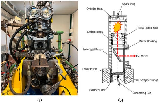 The experiments were performed on a 500-cc single-cylinder optical access engine (Figure 1) featuring a pent-roof combustion chamber, four valves, a quartz crown piston and a reverse-tumble-intake port system designed for port fuel injection (PFI) operation. The optical configuration, composed of a quartz crown piston and a 45-degree mirror, utilizes a mixture of Teflon and graphite for cylinder liner and piston rings, in order to allow dry contact between these components [,]. Additional specifications can be found in Table 1.