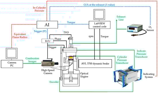 A research ECU (Athena GET HPUH4) controlled both the injector energizing time and IT via a trigger signal to the igniter control unit. The experimental setup, including inputs (blue dashed lines) and outputs (red dashed lines) for the AI, is shown in Figure 2, with further details listed in Table 2.