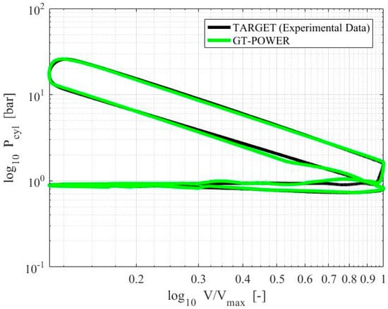 GT-POWER engine model validation: logP-logV curves for numerical (green) and experimental (black) data at  = 2.0 and IT = −13 CAD aTDC.