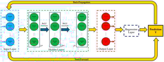 For this study, a Back-Propagation Artificial Neural Network (BPANN) was selected as the artificial neural network []. BPANN is a type of ANN widely used in supervised learning operations. It is structured to learn from input data by minimizing the error between its predictions and the actual outcomes through a method called back-propagation. The network, shown in Figure 6, is organized into layers: an input layer for receiving raw data, one or more hidden layers for processing the data, and an output layer for producing predictions. Neurons in these layers multiply inputs by weights, apply activation functions like Sigmoid or ReLU to introduce non-linearity, and pass results to the next layer [].