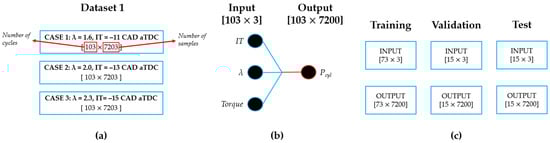 Figure 7c illustrates the data partitioning used for model training and evaluation. The data are divided into training, validation, and test subsets. The training set includes 73 cycles, with an input dimension of [73 × 3] and an output dimension of [73 × 7200]. The validation and test sets each consist of 15 combustion cycles per case, characterized by input dimensions of [15 × 3] and output dimensions of [15 × 7200]. This partitioning scheme is designed to support model training and performance assessment.