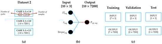 Figure 8c depicts the data partitioning utilized for model training and evaluation. The data are divided into training, validation, and test subsets. The training set comprises seven cycles, with an input dimension of [7 × 3] and an output dimension of [7 × 7200]. The validation subset consists of two cycles, characterized by input dimensions of [2 × 3] and output dimensions of [2 × 7200]. In contrast, the test subset includes one specific cycle per CASE, with input dimensions of [1 × 3] and output dimensions of [1 × 7200]. Moreover, each output obtained for each CASE was subsequently compared with the corresponding output generated by GT-POWER.