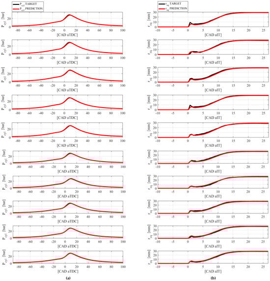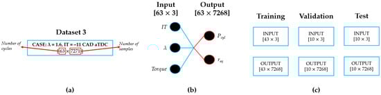 Figure 9b presents the model’s input–output structure. The input has dimensions of [63 × 3], indicating 63 combustion cycles with three variables: IT, , and torque. The output matrix [63 × 7268] corresponds to the Pcyl and the related req, with sizes of [63 × 7200] and [63 × 68], respectively.