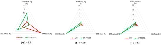 Figure 10, Figure 11, and Figure 12 provide a detailed comparison of the BPANN model’s performance in predicting Pcyl across 45 combustion cycles for Dataset 1 (15 cycles for each case, as specified in Figure 7), with  values of 1.6, 2.0, and 2.3, and IT of −11, −13, and −15 CAD aTDC, respectively. In the figures, predictions (red curves) closely match the target values (black curves), illustrating the model’s accuracy under these varying operating conditions. Furthermore, for each cycle, the accuracy of predicting the maximum in-cylinder pressure (Pmax) and the crank angle degree at which Pmax occurs (APmax) was assessed. As demonstrated in Table 5, Table 6 and Table 7, the values of RMSE Pcyl, ERR Pmax, and ERR APmax remain significantly below the upper limit of 10% across all cycles. Specifically, for  = 1.6, the average RMSE Pcyl is 0.36%, with ERR Pmax averaging 1.39% and ERR APmax averaging 4.59%. As  increases to 2.0, the average RMSE Pcyl increases slightly to 0.41%, while ERR Pmax and ERR APmax also rise to averages of 1.70% and 4.82%, respectively. At  = 2.3, the average RMSE Pcyl further increases to 0.44%, with ERR Pmax and ERR APmax showing average values of 1.78% and 4.92%, respectively.