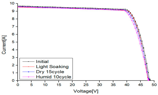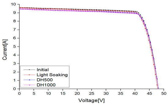 Example test results of a high-temperature and high-humidity test of a shingled module made of PERCs are as follows: the test was conducted for 1000 h at 85 °C and 85% relative humidity (RH) conditions after 5 kWh of light soaking, as shown in Figure 1.