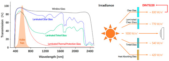 DIN 75220 is a testing standard established by the Deutsche Institute für Normung (Figure 3). The test, which was created in 1992 and has been in use since then, ages automobile components in solar simulation units using a solar simulator [26]. The purpose of this test is to evaluate the long-term reliability of automotive interior components by simulating the parts of the polymer material that are deteriorated by solar energy. Although this test is often used to evaluate samples made of a single material, it can also identify the interactions between each component of a sample made of various materials. Therefore, this test is suitable for PV modules composed of various materials. The wavelength of the artificial light source, which is the main component of DIN 75220, was defined differently from that of the PV test standard.