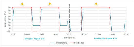 In the PV modules, indoor cycle test 2 was applied among the cycle tests. It consisted of a dry climate cycle, which took 24 h and was repeated 15 times, and a humid climate cycle, which took 24 h and was repeated 10 times. The dry and humid climate cycles consisted of the following steps:
