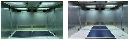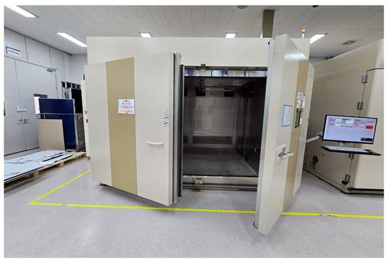 Figure 6 shows the chamber used for the IEC 61215 and DIN 75220 tests. This chamber is capable of simulating solar irradiance (1 sun) and can adjust the ambient temperature from −40 °C to +90 °C. It also has the ability to control relative humidity between 25% and 80%. This chamber is used as a measuring device in KOLAS (Korea Laboratory Accreditation Scheme) accredited testing, and it undergoes regular calibration once a year. Table 4 summarizes the calibration results.