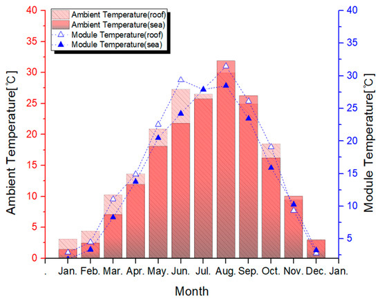 Figure 10. Comparisons of module and ambient temperature of Gunsan and campus rooftop (test site).