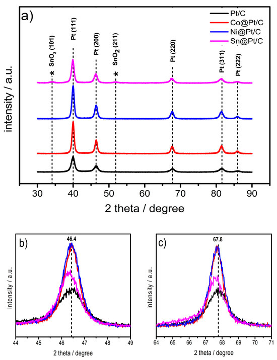 The XRD patterns of the Co@Pt/C, Ni@Pt/C, and Sn@Pt/C catalysts are presented in Figure 1a and compared with the Pt/C catalyst. It can be observed that all samples presented the diffraction peaks characteristic of the face-centered cubic (fcc) structure of Pt, with 2θ values of approximately 40.0°, 46.4°, 67.8°, 81.5°, and 86.0° corresponding respectively to the planes 111, 200, 220, 311, and 222. In the XRD pattern of Sn@Pt/C, two other small peaks are observed at 2θ values of 34.1° and 51.9°, ascribed to the 101 and 211 planes of SnO2, respectively (JCPDS No. 41-1445). For the Co@Pt/C and Ni@Pt/C samples, no other diffraction peaks are observed besides those attributed to Pt. No diffraction peaks were observed for core metals, indicating their amorphous nature. Figure 1b,c shows the diffraction peaks of the 200 and 220 planes, respectively, in which no displacement of the Pt peaks is evident, despite the presence of other metals. The 2θ values for the Co@Pt/C and Ni@Pt/C catalysts were very similar to those presented by Pt/C, indicating no alloy formation with the non-precious metals. A shift of the 200 and 220 peaks to lower angles, instead, was observed for the Sn@Pt/C catalyst, indicating the formation of a PtSn alloy. The lattice parameters of Co@Pt/C, Ni@Pt/C, Sn@Pt/C, and Pt/C catalysts are reported in Table 1. The lattice parameter of the Co@Pt/C and Ni@Pt/C was the same as Pt, indicating no alloy formation, while that of Sn@Pt/C was lower, indicating the partial formation of a PtSn solid solution. Pt peak shifts were similarly observed in the study by Cantane et al. [], where the authors attributed this phenomenon to the partial formation of a solid solution between Pt and the secondary metal at the interface between the core and the Pt surface layer. The fcc Pt peaks in Sn@Pt/C and Pt/C catalysts were sharper than those in Co@Pt/C and Ni@Pt/C, indicating that the crystallite size of Co@Pt/C and Ni@Pt/C is larger than that of Sn@Pt/C and Pt/C. To calculate the crystallite size, the Scherrer equation was applied to the 220 peak of Pt. A proportionality constant “K” of 0.9 was used, based on the assumption of predominantly spherical particle shapes. The parameter “β” represents the full width at half maximum (FWHM) of the diffraction peak, while the wavelength “λ” was set to 0.15406 nm [,,], corresponding to the Kα radiation of Cu utilized by the equipment. The crystallite size values obtained are presented in Table 1.