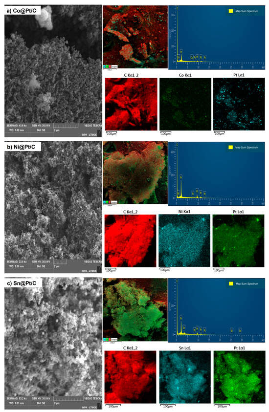 SEM micrographs and EDS mapping of (a) Co@Pt/C, (b) Ni@Pt/C, and (c) Sn@Pt/C catalysts.