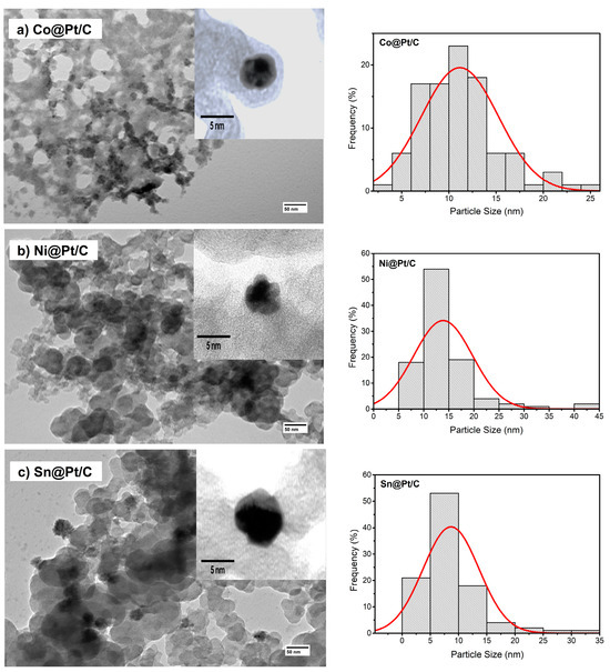 Figure 3a–c presents the TEM analysis results for the Co@Pt/C, Ni@Pt/C, and Sn@Pt/C catalysts. The particles exhibit a predominantly spherical shape and satisfactory dispersion on the carbon support. However, regions with particle agglomeration were also identified. The particle size distribution histograms provide a quantitative assessment of the particle sizes, with average values listed in Table 1. A notable congruence is observed between the particle sizes determined via TEM and the crystallite sizes calculated from XRD measurements.