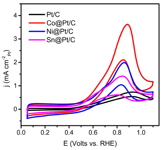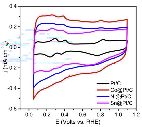 The Co@Pt/C, Ni@Pt/C, and Sn@Pt/C catalysts were subjected to cyclic voltammetry analysis in 0.5 M KOH electrolyte saturated with N2 at room temperature and compared with the Pt/C catalyst. Figure 4 shows the profiles obtained for each sample using a scan rate of 50 mV s−1 in a potential range from 0.05 to 1.1 V vs. RHE. The voltammograms obtained for the Co@Pt/C, Ni@Pt/C, and Sn@Pt/C catalysts showed the characteristic profiles for Pt-based materials. Three well-defined regions can be observed: (i) 0.05 to 0.4 V vs. RHE, known as the hydrogen adsorption/desorption region; (ii) 0.4 to 0.8 V vs. RHE, corresponding to non-faradaic processes, which originate from the charging of the electric double layer; and (iii) 0.8 to 1.1 V vs. RHE, referred to as the oxygen region, associated with the OH− adsorption process. In the cathodic scan, it is possible to observe peaks around 0.75 V vs. RHE, which is related to the reduction of oxides formed in the anodic scan []. The absence of peak shifts in the X-ray diffraction (XRD) patterns of Co@Pt/C, Ni@Pt/C, and Sn@Pt/C compared to Pt/C suggests that the surface of these catalysts is primarily composed of Pt. This is further supported by the presence of hydrogen adsorption/desorption regions in their voltammograms, similar to those observed for polycrystalline Pt. However, the incorporation of Co, Ni, and Sn within the core likely influences the formation of the electrical double layer at the electrode surface, as evidenced by the changes observed in the voltammetric profiles [,,,,].