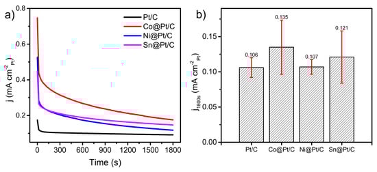(a) Chronoamperometry at 0.6 V vs. RHE for 1800 s for the Co@Pt/C, Ni@Pt/C, Sn@Pt/C, and Pt/C catalysts. Electrolyte: 0.5 M KOH + 1.0 M glycerol; (b) current density values after 1800 s.
