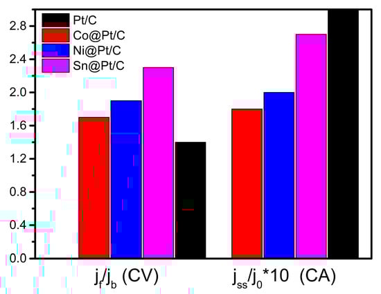 In this context, Sn@Pt/C, Ni@Pt/C, and Co@Pt/C core–shell catalysts have shown promising results. As shown in Figure 7, the Sn@Pt/C catalyst exhibits the highest If/Ib ratio among the three, followed by Ni@Pt/C and Co@Pt/C. This superior tolerance in Sn@Pt/C can be attributed to two factors: a bifunctional mechanism involving Sn oxides and an electronic effect between platinum and tin in the PtSn alloy [].