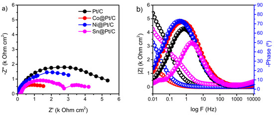 Nyquist diagram (a) and Bode diagram (b) of Co@Pt/C, Ni@Pt/C, Sn@Pt/C, and Pt/C catalysts. Electrolyte: 0.5 M KOH + 1.0 M glycerol. Frequency range: 10,000–0.01 Hz. Potential: 0.6 V vs. RHE.