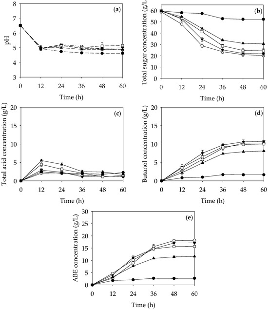 Profiles of pH (a), sugar (b), acids (c), butanol (d), and ABE (e) during ABE fermentation by C. beijerinckii TISTR 1461 in modified P2 media containing mixed sugars (60 g/L of total sugars) of glucose and xylose at different ratios: glucose:xylose = 100:0 (○), 75:25 (▼), 50:50 (□), 25:75 (▲), and 0:100 (●).