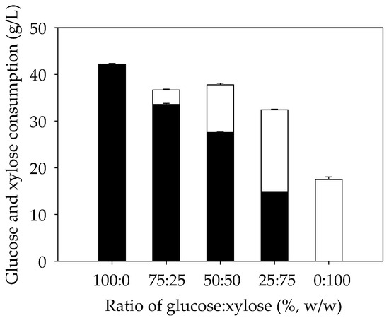 At the end of fermentation, fermentable sugars were not completely utilized. Some sugars remained in the broth, even in the medium containing only glucose (100:0) (Figure 1b). This may be due to butanol toxicity or catabolite repression [46,47,48,49]. When the final glucose and xylose contents were determined, the most glucose consumed, 42.20 g/L, was in the medium containing only glucose (no xylose addition). Glucose consumption was lower in the media containing higher xylose contents (Figure 2). C. beijerinckii consumed more xylose when the xylose in the medium was increased from 25% to 75%. Xylose consumption in a medium containing only xylose (100%) was not different from the medium containing 75% xylose, indicating that the highest capability of Clostridium to consume xylose was ~17 g/L.