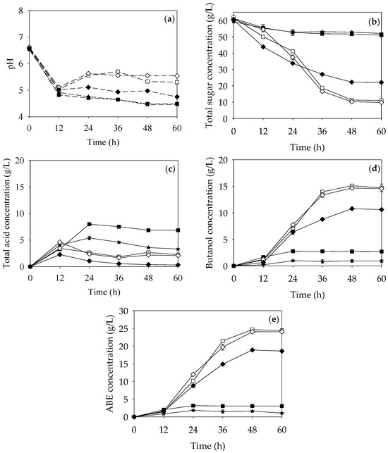 Profiles of pH (a), total sugar (b), total acid (c), butanol (d), and ABE (e) concentrations during ABE fermentation by C. beijerinckii TISTR 1461 from SSBH with no supplementation (★), SSBH-YE (■), SSBH-YE-Buf (□), SSBH-Nut in P2 (◇), and P2 medium (◆).