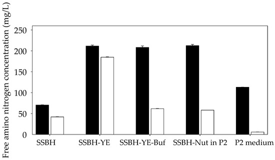 FAN concentrations in the broth during ABE fermentation from SSBH, SSBH-YE, SSBH-YE-Buf, SSBH-Nut in P2, and P2 medium by C. beijerinckii TISTR 1461 at the beginning (black bars) and end of fermentation (white bars).