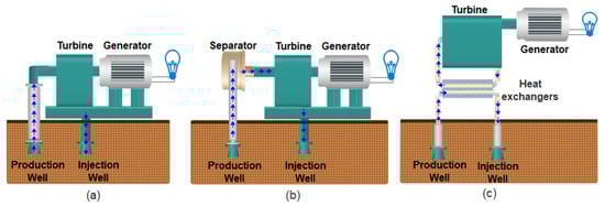 (a) Dry steam GPP; (b) flash steam GPP; and (c) binary cycle GPP [18].