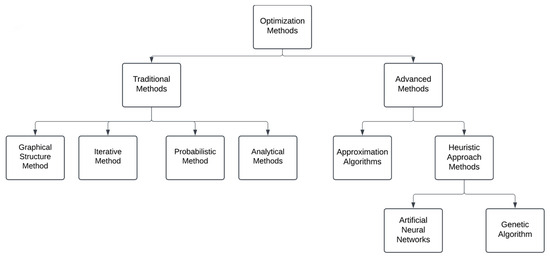 Optimization, by definition, can be described as the process of finding the best solution under certain conditions for one or more independent variables in the examined problem [19]. Optimization can be examined under two main categories. Each method has been analyzed in the literature under subcategories. The main categories are traditional and advanced methods. In the literature, they are subcategorized: artificial intelligence, multi-objective approach, analytical method, iterative method, probabilistic approach, graphical structure method, and various computer softwares, etc. [20]. Some optimization categories are shown in Figure 2 [20,21].