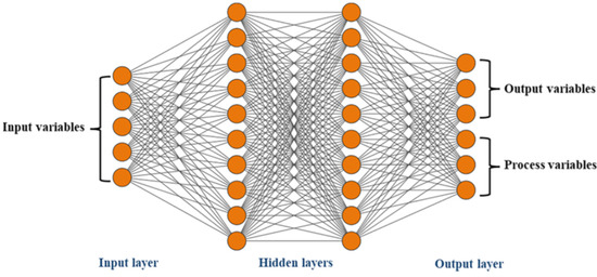 Artificial neural networks (ANNs) are computational models inspired by the human brain. They can model the connections between inputs and outputs in a problem mathematically. ANNs are massively parallel distributed processors made up of simple processing units that have a natural propensity for learning and using knowledge. They acquire knowledge through a learning process and store it as synaptic weights and biases, analogous to the brain’s structure [34]. Regression and classification models with fixed basis functions have useful analytical and computational properties. However, for solving high-dimensional problems and applying complex models in practical applications, it is essential to adapt the basis functions significantly to the data. ANNs, on the other hand, provide faster and more practical results when establishing connections among large amounts of data. ANNs are one of the best applicable methods in this context [35]. Figure 3 shows the schematic model of an artificial neural network [36].