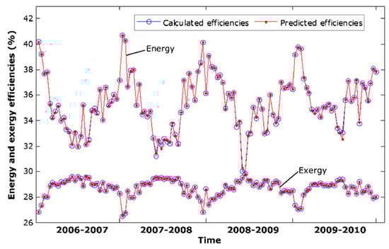 The Afyonkarahisar geothermal district heating system was modeled using artificial neural network tools available in MATLAB by Keçebaş et al. [7]. Thermodynamic analysis results were compared with the neural network results, and energy efficiencies were found to be 35.38% and 35.39%, respectively. The analysis results indicate that artificial neural networks (ANNs) can also be used to monitor system performance. Figure 6 compares findings from ANNs with actual data, demonstrating the consistency of ANN models in system modeling. In addition to ANNs, genetic algorithms (GAs) are preferred for their ability to generate potential solution sets for complex problems. He et al. used a GA in their study where the fitness function, determining the survival of individuals (solution sets), was selected as the ratio of input heat to the work obtained. This function aimed to ensure the survival of individuals that enhanced efficiency, resulting in a 16.18% increase in energy efficiency. GAs offer a different approach to geothermal plant optimization compared to traditional methods [51].