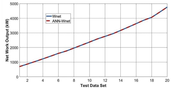 The fitness function is a crucial detail in GA modeling and can be defined using thermodynamic relations, various functions from the literature, or a newly developed function. It can also be written in vector form if one or more parameters are used [52]. GAs operate for a specified number of iterations to produce solution sets, which can vary by problem. Rudiyanto et al. found that general exergy efficiencies stabilized at 20, 50, and 100 iterations, allowing for shorter computation times without needing further iterations [31]. Yılmaz et al. [12] analyzed a complex hybrid geothermal and solar energy system using both GAs and ANNs. Figure 7 shows the net power output from actual data compared to the computation model.