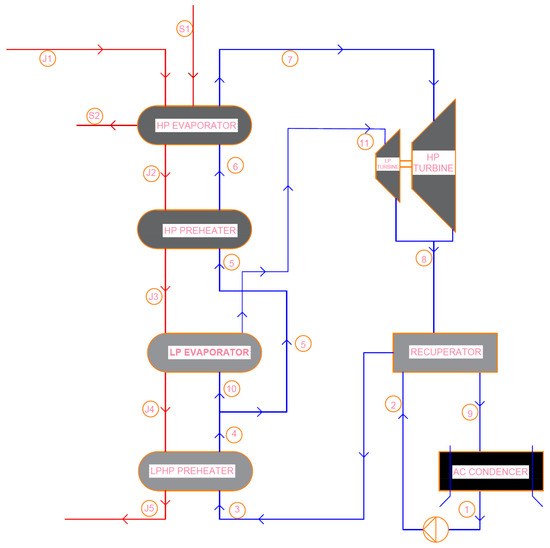 The specially designed turbine integrates high- and low-pressure stages into a single turbine, aiming to produce more energy with lower investment and operating costs. The heat and mass diagram using the design values of the plant is shown in Figure 8. In the diagram, the states represented by J, S, and numbers correspond to the states of brine, steam, and butane working fluid, respectively. Thermodynamic analyses were performed using SCADA screen images taken from the plant on 11 June 2024at 15:30, along with all data obtained from manual indicators installed during the plant’s setup, which could not be obtained electronically.