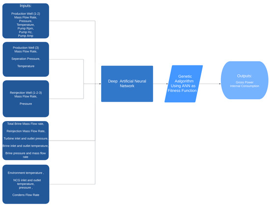 A computational model within the scope of this research was developed using the Python programming language, version 2.14.0, via Google Colab. The aim was to create an innovative analysis method using a genetic algorithm optimization method that employs deep artificial neural networks as the fitness function. Numerous libraries were utilized within the Python program. Particularly, the TensorFlow and Keras libraries, which are frequently used in the literature for artificial neural networks and genetic algorithms, were also employed in this study. Additionally, the Pandas, NumPy, and Matplotlib libraries were preferred to facilitate mathematical operations and data analyses within the model. The method developed for the optimization of the geothermal power plant requires data recorded by the plant’s SCADA system. The inputs and outputs of the method were generated using data obtained from this source. By optimizing the wells and the turbine, where power generation occurs, the operational conditions can be determined based on the available data. Consequently, a comparative thermodynamic analysis can be conducted with the obtained values, allowing for a reorganization of the plant’s operations to achieve efficient performance.