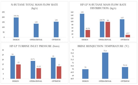 The developed calculation method optimized the operating conditions under the same environmental conditions. As a result of the analyses, the net power produced by the plant increased from 3748 kW to 5225 kW. Under optimal operating conditions, the reinjection temperature was reduced from 72.6 °C to 70.33 °C, allowing for greater energy and exergy input. Additionally, the flow rate and pressure of butane were increased to make the system more efficient. Due to these increases, the internal consumption of the ORC also increased. However, the amount of increase in gross energy obtained was much greater than the increase in internal consumption. This resulted in a net power increase of 1477 kW. Under optimal operating conditions, the temperatures and pressures at the equipment’s inlet and outlet were balanced, reducing thermal stresses during operation. Simultaneously, the exergy destruction in the equipment was significantly reduced. Specifically, the exergy efficiency of the high-pressure preheater increased from 57.85% to 89.82%. The exergy efficiencies of all equipment improved after optimization. Consequently, the overall plant exergy and energy efficiencies became 34.62% and 8.62%, respectively. The gross power increase was 34%, while the increase in internal consumption was 17%. When comparing the design parameters with the optimal operating conditions, the equipment’s exergy efficiencies were found to be close to the design values.