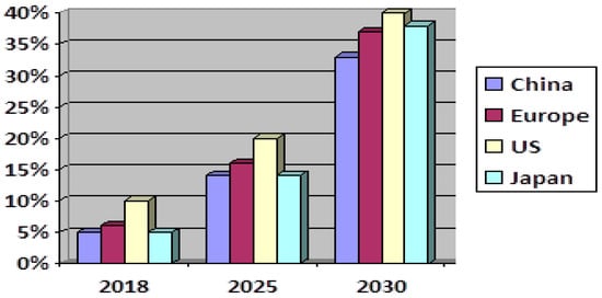 In an effort to help mitigate greenhouse gas emissions, an EU rule (2019/631) has set emission reduction targets that are required for new cars manufactured between 2025 and 2030 [1,2,3,4]. This regulation lays out a precise plan for reducing CO2 emissions from the transportation industry. For example, starting on 1 January 2025, the average emissions of new passenger car fleets should be reduced by 15%, and starting on 1 January 2030, they should be reduced by 37.5%. In order to meet these goals, electric vehicles are emerging as a strong contender to effectively replace conventional cars with internal combustion engines that run on fossil fuels [5,6,7]. Nevertheless, the creation of novel technologies to improve the environmental friendliness and efficiency of using conventional resources for vehicles has not been able to significantly slow down the rate at which air pollution and global warming are increasing. Thus, it is necessary to take safety measures to reduce the amount of fuel used by vehicles. Over the past ten years, the popularity of electric vehicles (EVs) has grown quickly. As an example, the global inventories of electric passenger cars hit 5 million in 2022, representing a 63% increase from the year before [7]. Figure 1 shows the International Energy Agency’s forecast for EV sales from 2018 to 2030.