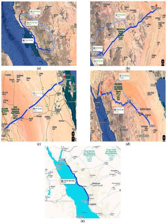 (a) The Makkah to Abha road, (b) the Makkah to Riyadh road, (c) the Riyadh to Dammam road, (d) the Riyadh to NEOM road, and (e) the Jeddah to NEOM road.