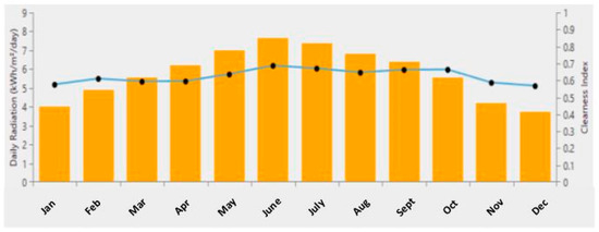 Long distances require careful planning for charging electric vehicles, including careful testing of the location of charging stations based on the solar energy sources available on each individual route. Three stations with a capacity of 200, 300, and 500 kW were designed at equal distances. Solar energy sources were taken into account when selecting the site for all the study routes except for the Riyadh to NEOM and Jeddah to NEOM routes. Six charging stations were designed on the two routes: two with a capacity of 200 kW, two with a capacity of 300 kW, and two with a capacity of 500 kW because the distance between the two routes was almost twice the distance of the other study routes. When installing a PV system, the daily radiation (kWh/m2/day) and the clearness index related to the location coordinates must be defined and used properly. In accordance with NASA surface meteorology, these data were received directly from the HOMER database to address the uncertainty in the available solar energy, and Figure 3 depicts the daily radiation during the months of the year. The max daily radiation (kWh/m2/day) was 7.6, 7.3, 7, and 6.9 during June, July, May, and Aug., respectively. The daily radiation per min (kWh/m2/day) was 3.8 and 4.1 during Dec. and Nov., respectively.